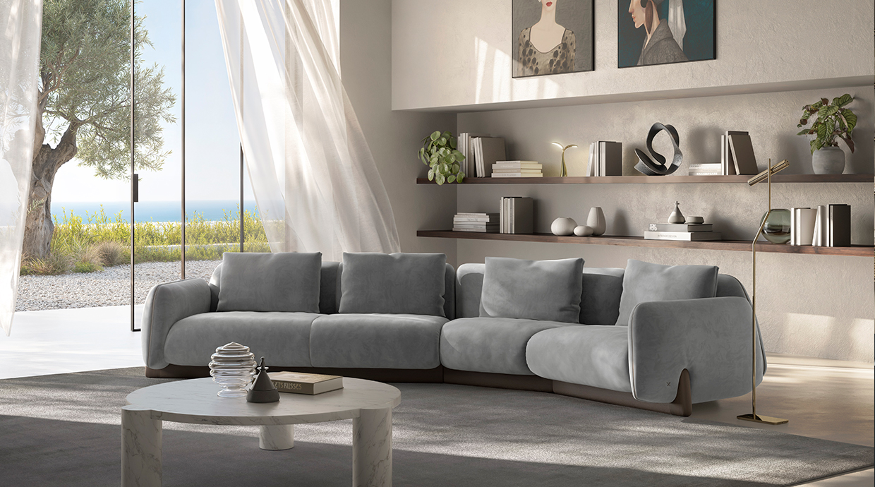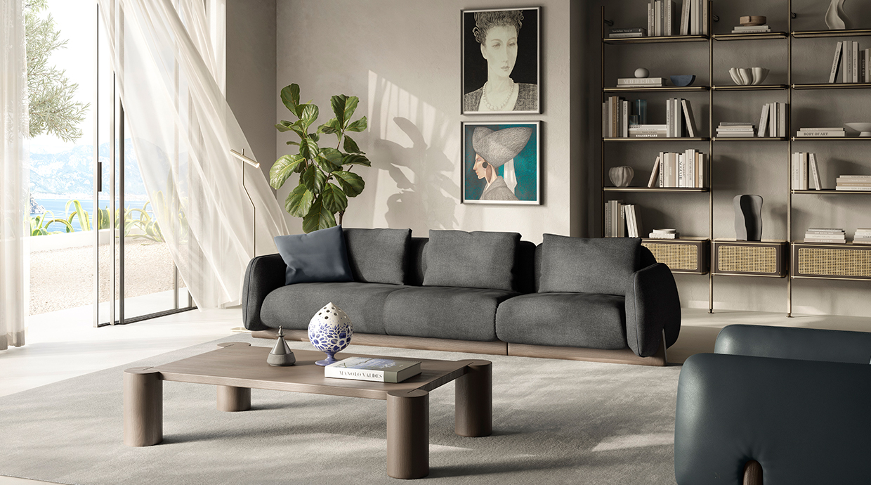 2024年ゴールド賞とarchiproducts AWARDSを受賞したMIRAIソファと曲線的な木製テーブル。アンドレア・ステイドルによるデザイン