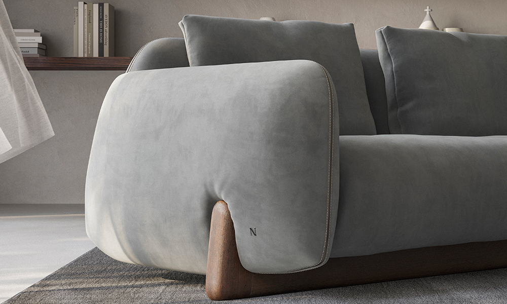 ウッド素材の脚、アームと背もたれに装飾された1本のラインなど、力強くも軽やかな個性を備えた造りで、建築的な深みと現代的な柔らかさを融合させています。