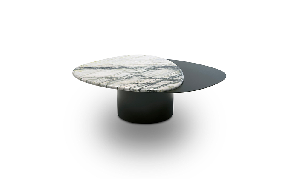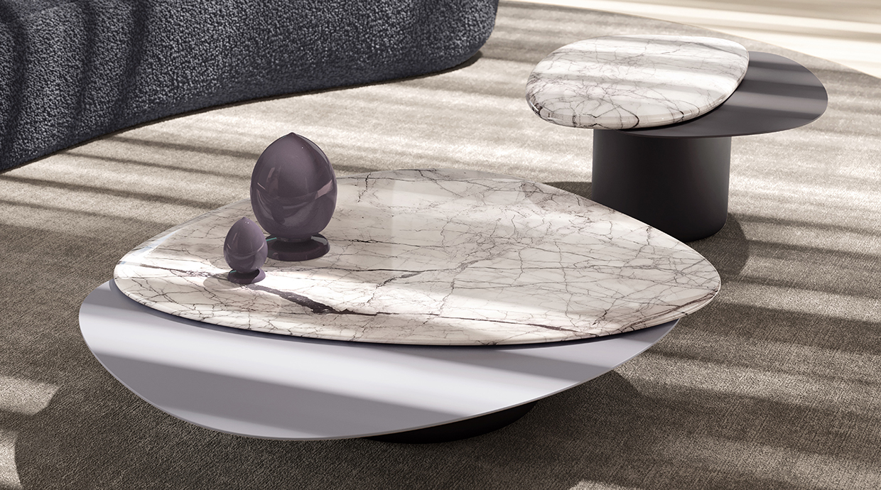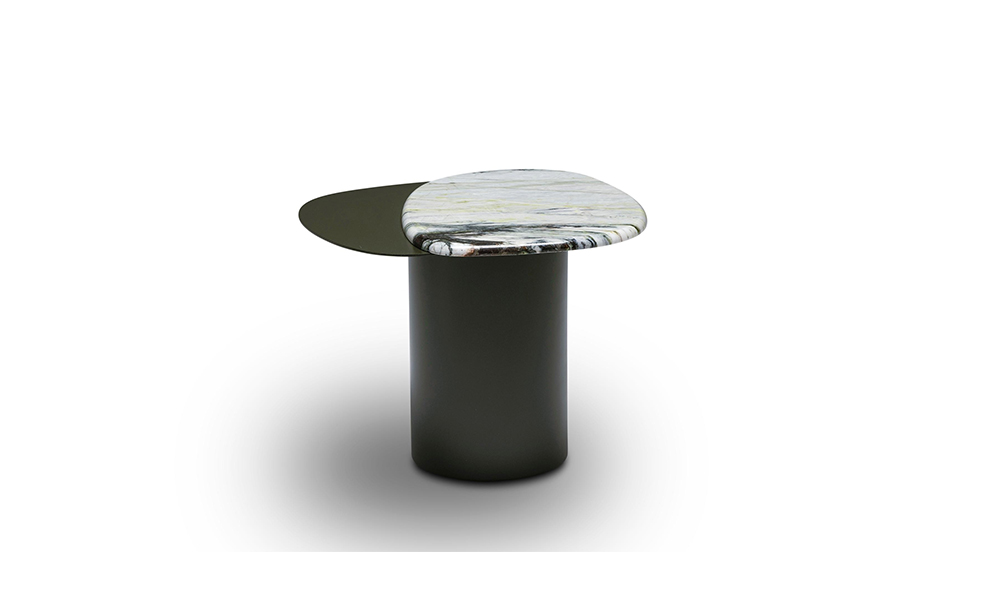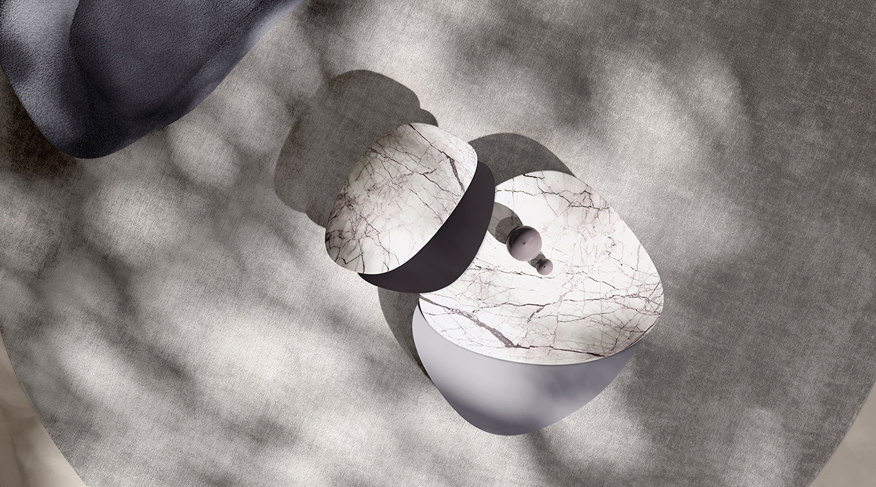 水の流れからインスピレーションを得た、有機的な形状の小さなテーブル。シンプルなラインとボリューム感が、職人の技とディテールで飾られた優美なデザインです。メタルと大理石の異素材が巧みに合わさり、2色の対比が滑らかに融合しています。