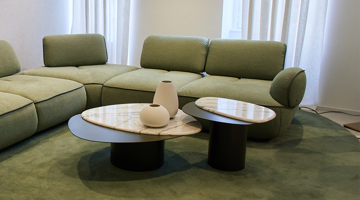 2024年ゴールド賞とarchiproducts AWARDSを受賞したMIRAIソファと曲線的な木製テーブル。アンドレア・ステイドルによるデザイン
