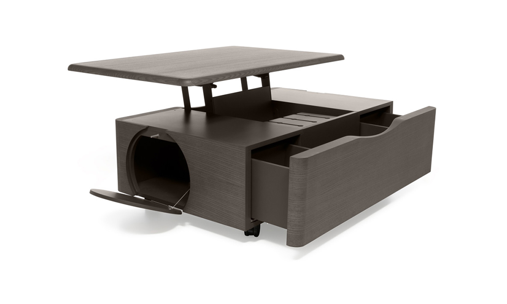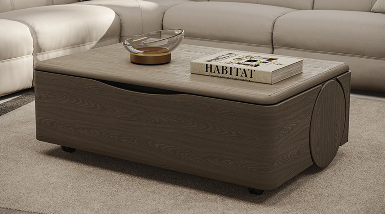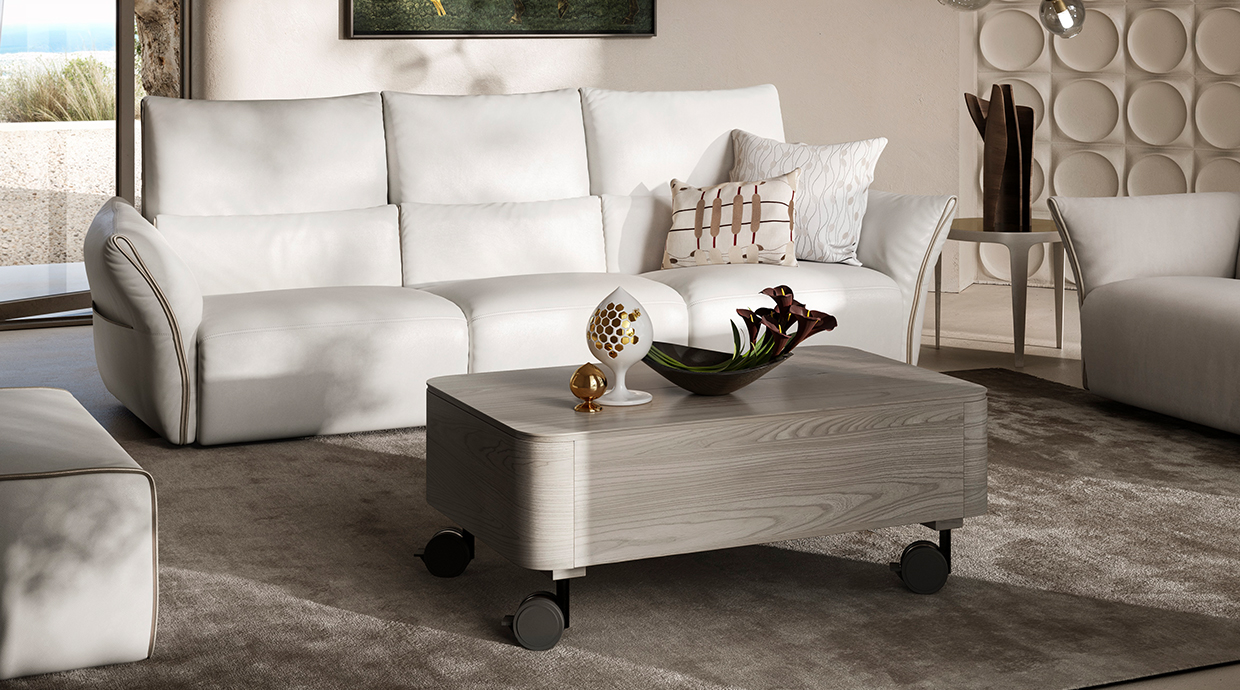 機能性とデザインを兼ね備えたRollテーブル。天板はリフトアップし作業しやすい高さになり、テーブルの中にはたっぷり収納スペースがあります。すべてを手の届く範囲に置いて、リビングで快適に作業をしたり寛いだりしてください。キャスター付きで移動もスムーズです。