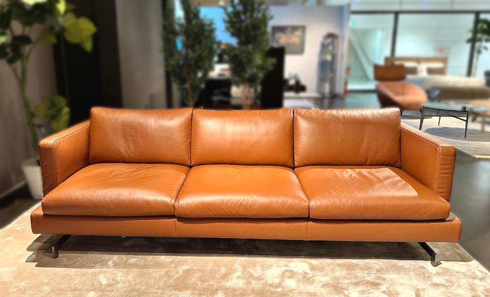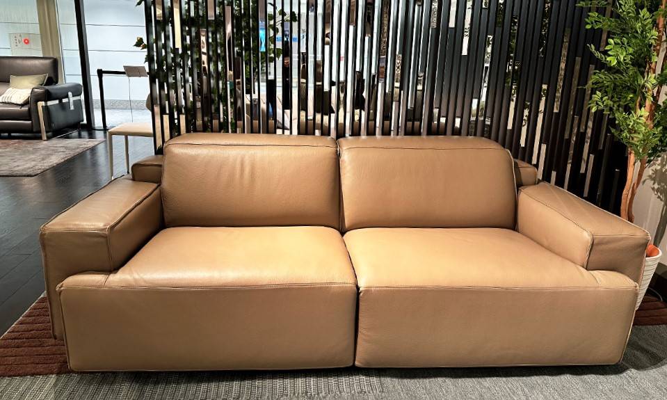 静けさと落ち着きを具現化したミニマルデザイン。低反発ウレタンを贅沢に使用し、長時間でも快適に座れる設計。展示モデルは滑らかな手触りの本革仕様です。