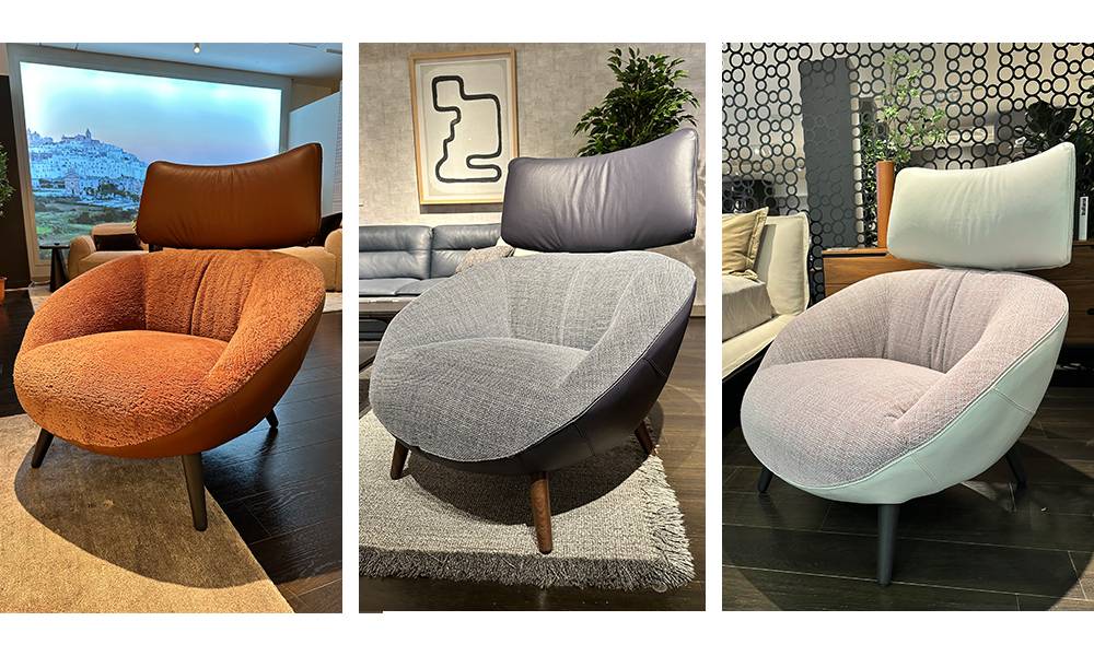 レザーとファブリックのMIX張りが美しいアームチェア。ゆったりとした座面とヘッドレストが生む快適さに加え、レザーインサートが曲線美を際立たせます。