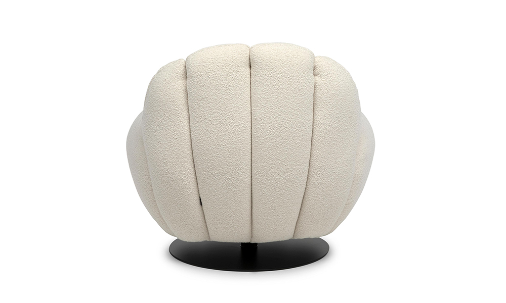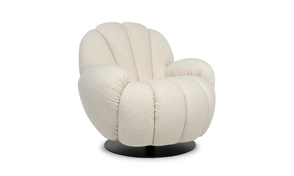360度回転するコンパクトなアームチェア。身体をやさしく包み込むフォームと、貝殻のようなデザインが軽やかなリズムを添えます。