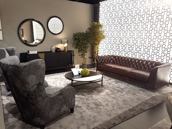 モダンな家具ショールーム。グレーのチェスターフィールドソファ、装飾的な仕切りスクリーン、オレンジのアクセントチェアを配置したラグジュアリーな空間