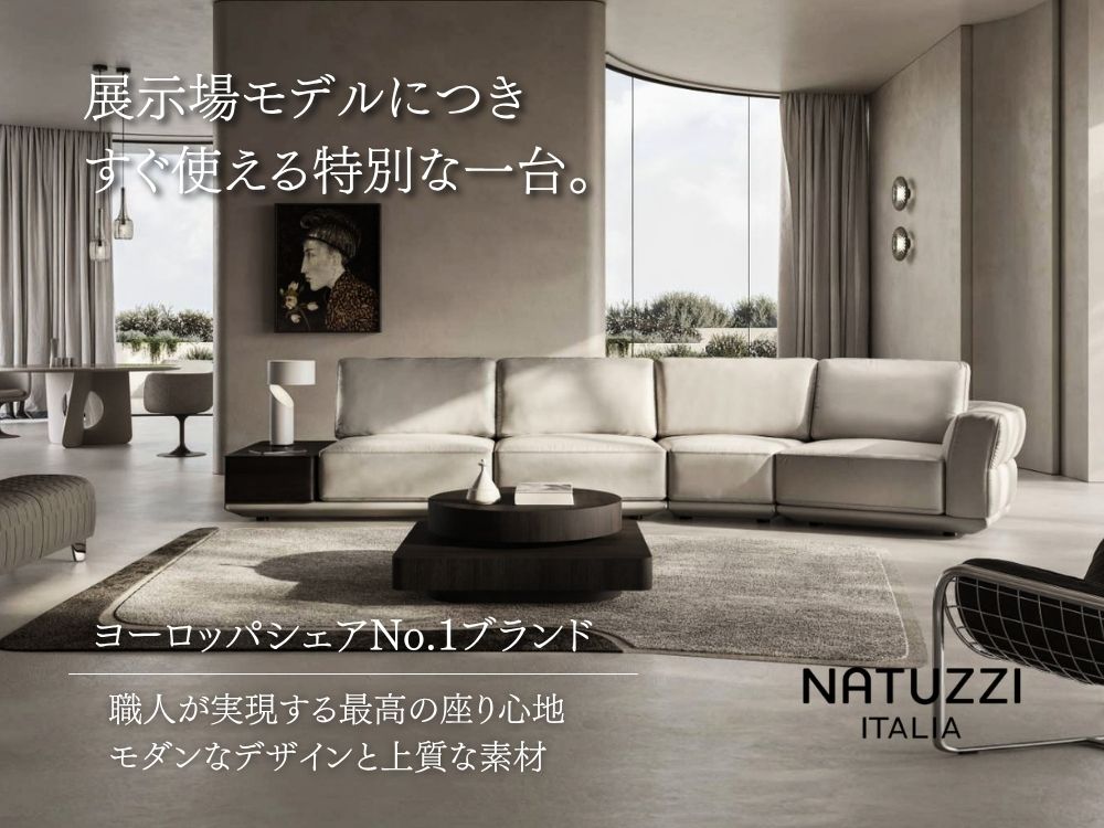 ナツッジ社の中でも、最高峰のブランド「NATUZZI ITALIA」の製品は、資材の92%を自社で管理し、イタリア製にこだわって生産しています。リビングルーム、ダイニングルーム、ベッドルームなど、お部屋全体をコーディネートできるよう、ソファを中心に、テーブルやボード、ベッド、インテリアアクセサリーまで取り揃えています。